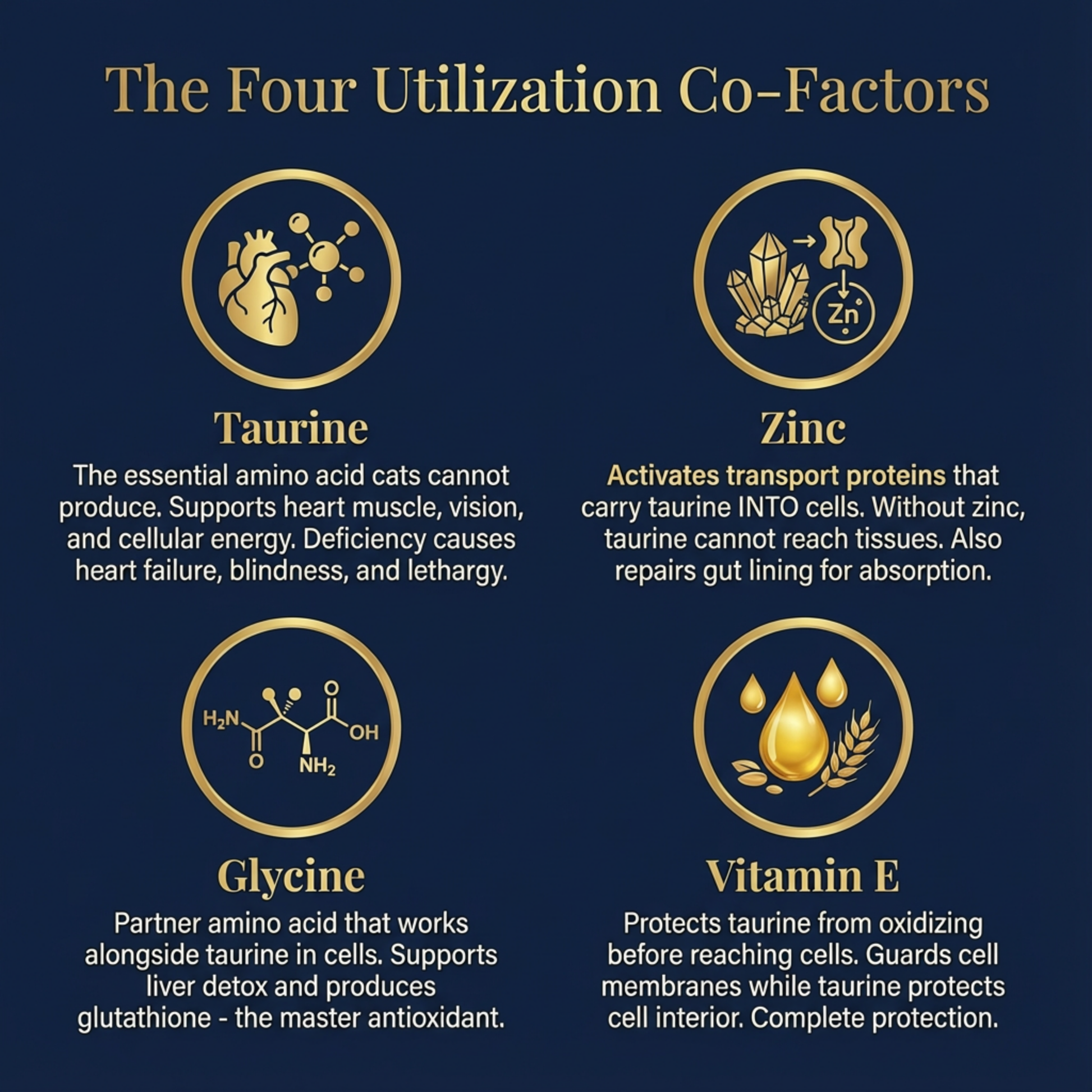 The Problem: Your cat eats taurine every day — but most of it never reaches their cells. Without 4 specific "keys" (Zinc, Glycine, Vitamin E, Iron), taurine can't pass through the cellular door. It floats in the bloodstream while the cells starve.